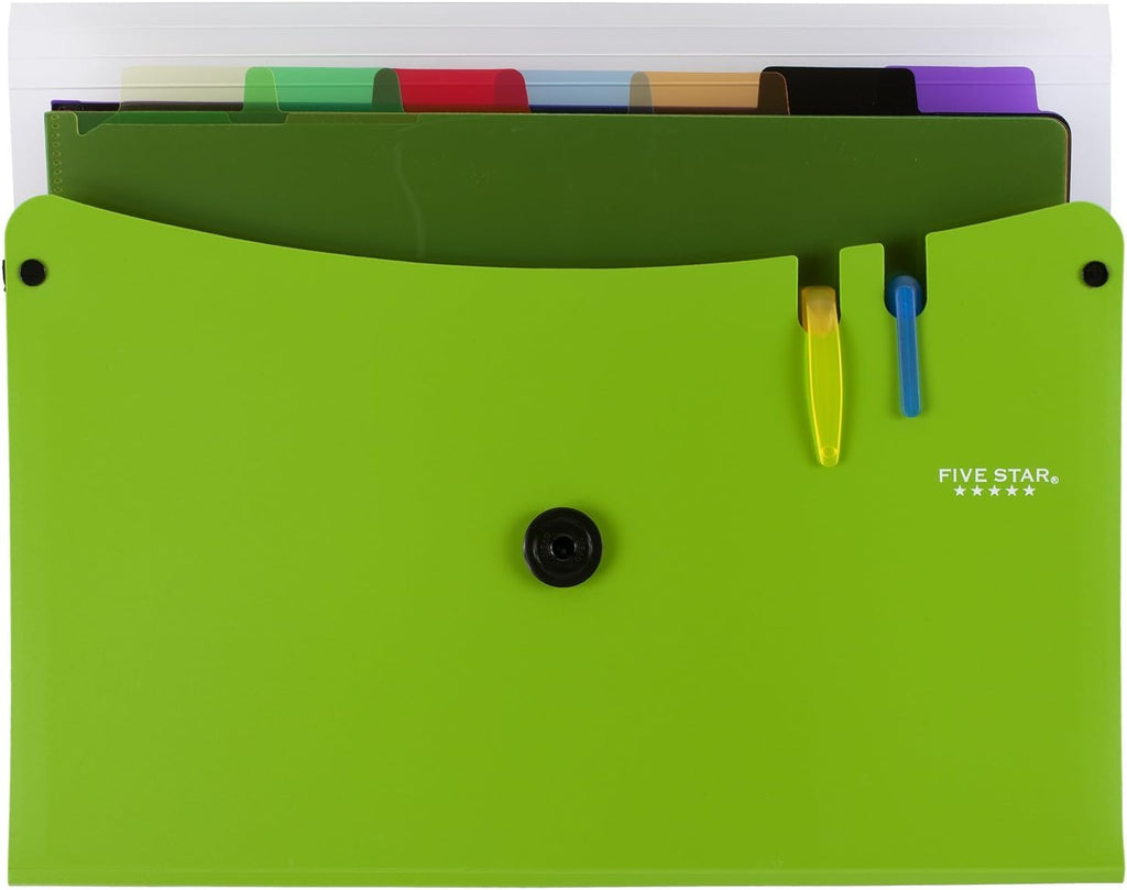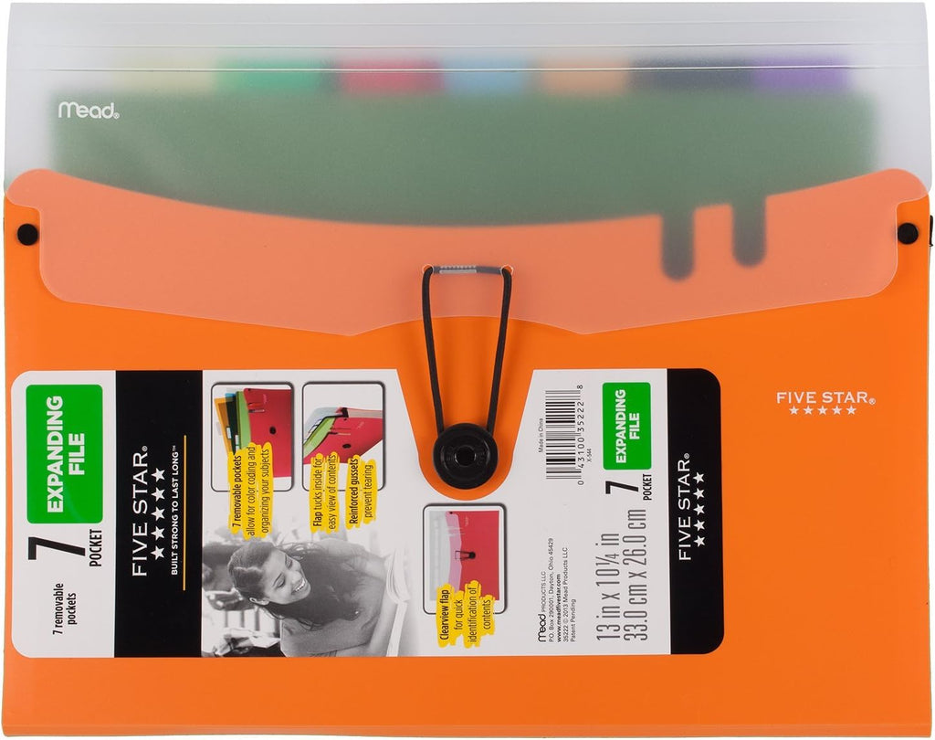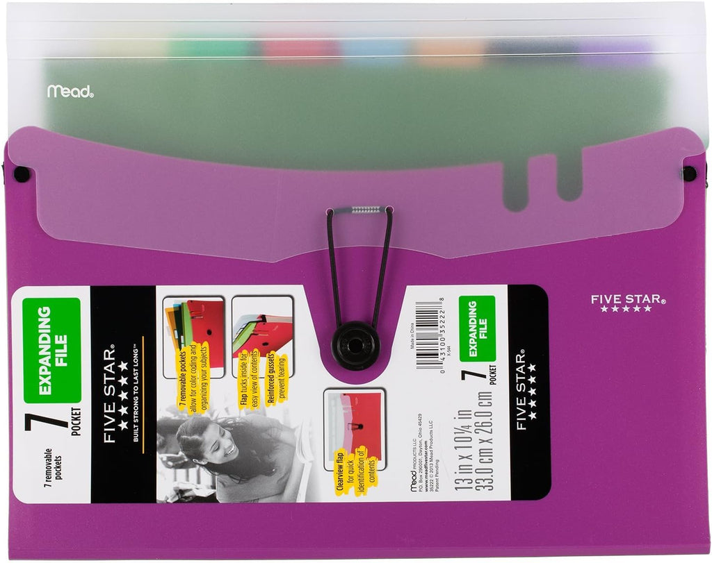 This 7-pocket expanding file is designed for durable, high capacity document organization at school, in the office, or on the go. Built with strong materials and a secure button and elastic closure, it keeps papers sorted and protected while allowing quick access when needed. The expanding design provides flexibility for growing projects, making it ideal for managing multiple subjects or workflows.