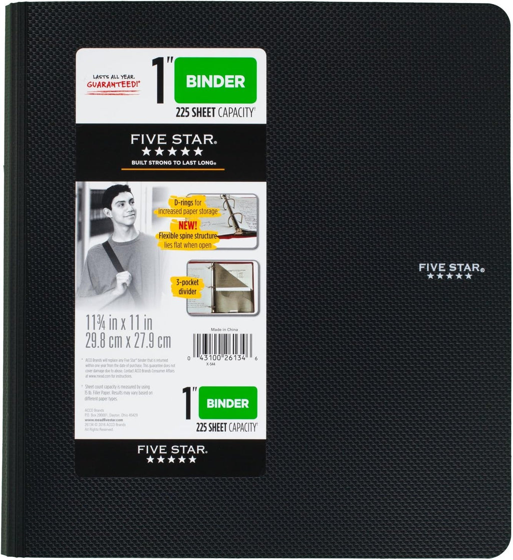 The Five Star 1 in D Ring Binder is designed for reliable, everyday organization with durability that lasts all year. Its sturdy textured cover and reinforced construction protect important papers, while the D ring mechanism improves page alignment and allows the binder to lie flat when open. Compact yet efficient, it is ideal for lighter workloads while still delivering trusted Five Star performance.