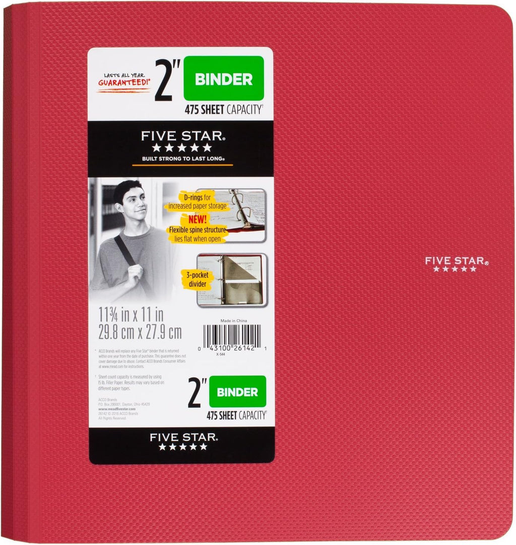 The Five Star 2 in D Ring Binder is built for long lasting performance and heavy everyday use at school or work. Designed with a durable cover and reinforced spine, it delivers reliable protection while maintaining a clean, professional look. The D ring mechanism increases sheet capacity and allows pages to lie flat, while the included divider helps keep materials neatly organized throughout the year.