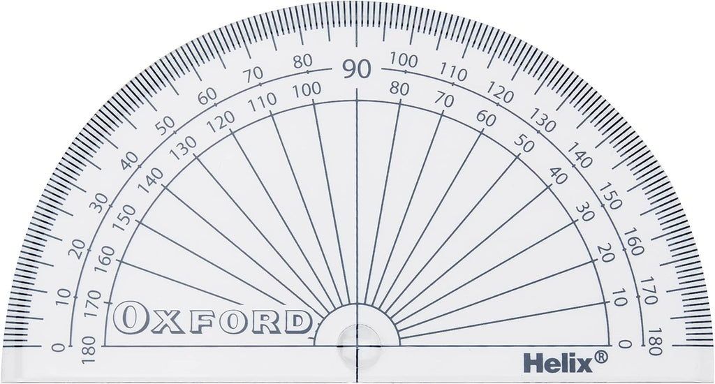 A classic 180-degree protractor from the trusted Helix Oxford range, designed for accuracy and clarity in mathematical and geometrical work. Made from durable, transparent plastic, it features a single-colour print and a reverse 180-degree scale for versatile use. Ideal for students and professionals alike, it fits easily into pencil cases and maths sets while maintaining the premium quality associated with the Helix Oxford name.