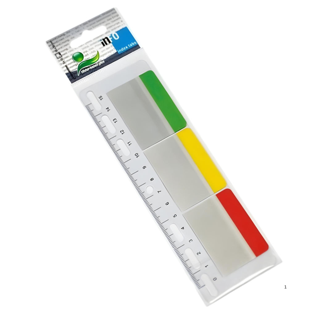 The inFO Notes Index Tabs on Transparent Plastic Ruler combine practicality and precision in one compact tool. Perfect for marking, highlighting, and measuring, this smart set includes color-tipped index tabs in red, yellow, and green neatly arranged on a durable clear ruler. The tabs are made of strong, transparent PET film with a removable adhesive that sticks securely and lifts cleanly, making it ideal for use in binders, notebooks, or planners.