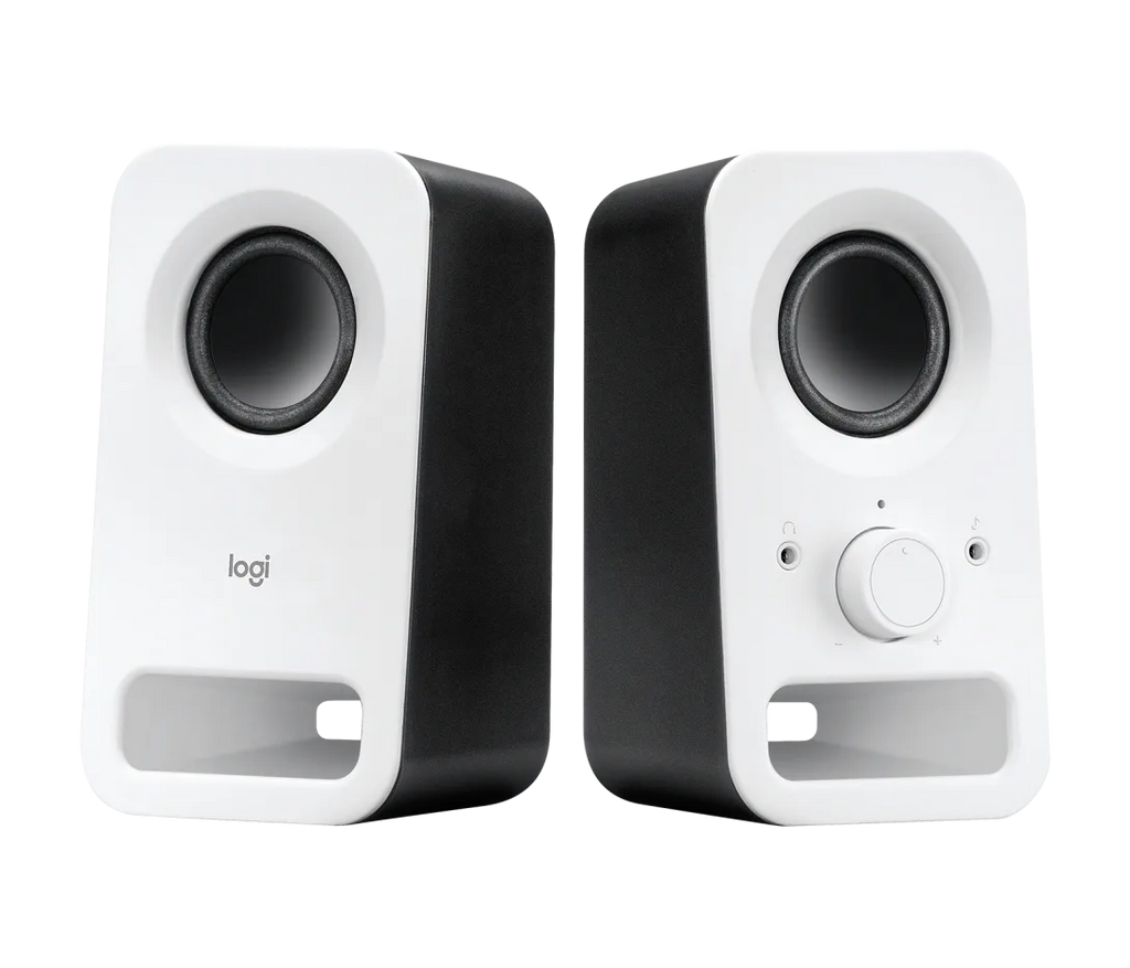 The Logitech Z150 Stereo Speakers provide clear stereo sound with 3W RMS power, dual 3.5 mm inputs, and a headphone jack for private listening. With easy-access volume and power controls on the right speaker, they are compact and versatile for home or office use.
