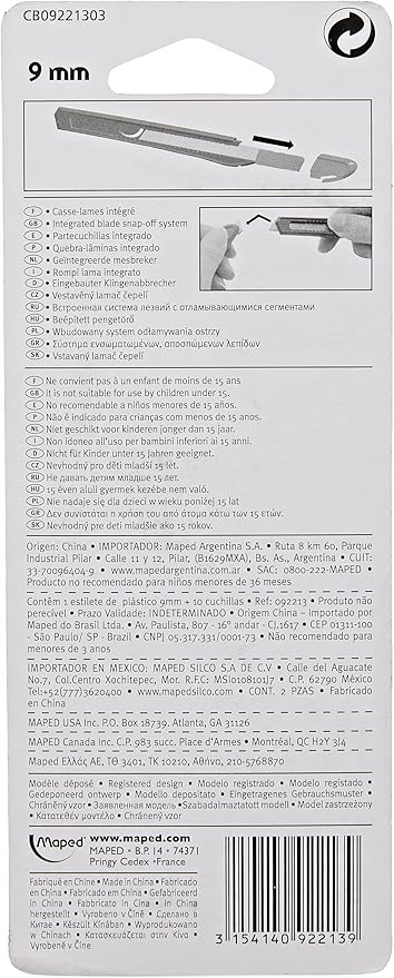 The Maped 9 mm Plastic Cutter is a lightweight and reliable tool designed for everyday precision cutting. Featuring an ergonomic red and black handle with a manual locking mechanism, it ensures full control and safety during use. Ideal for office, school, and craft applications, this cutter includes ten replacement blades and an integrated blade snap-off system for extended usability.
