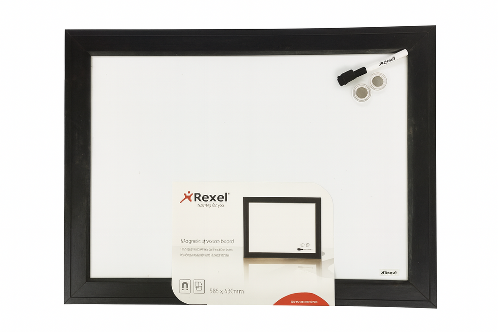 The Rexel Magnetic Dry Wipe Board is a sleek and versatile writing surface designed for both home and office use. Its modern black frame and smooth magnetic surface make it ideal for jotting notes, reminders, or creative ideas while keeping your workspace neat and organized. Built for everyday productivity, this durable board combines style with functionality for meetings, study areas, or home organization.