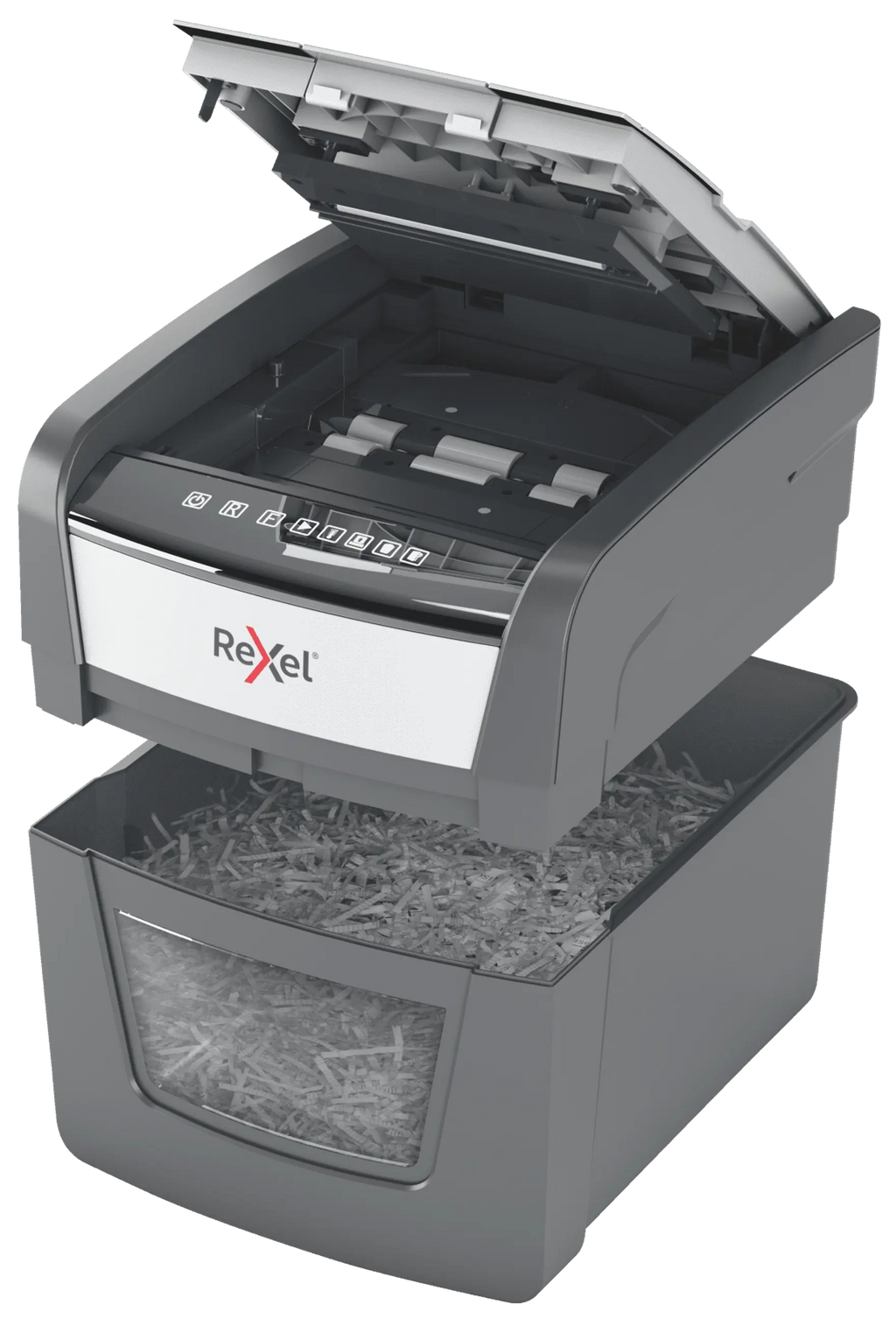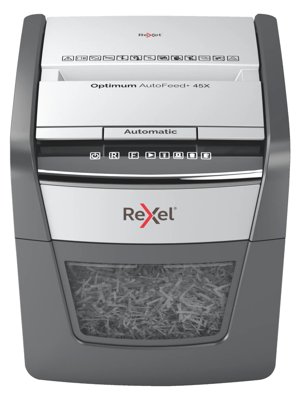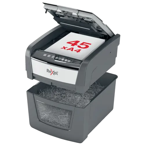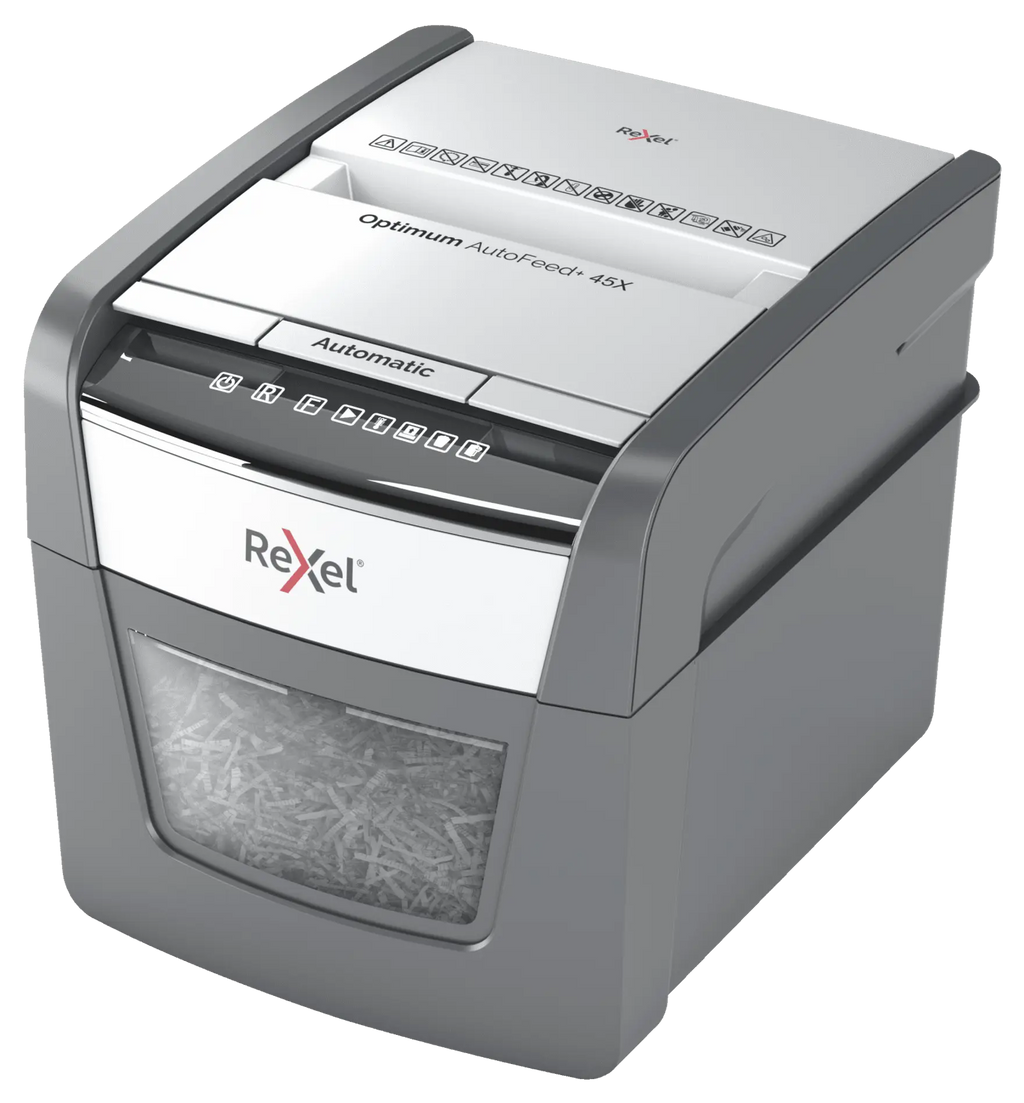 The Optimum AutoFeed 45X cross cut shredder automatically shreds up to 45x A4 sheets of paper (80gsm) at a time, into P-4 (4x28mm) cross cut pieces. This auto feed shredder machine is ideal for use as a home or home office shredder due to its compact 20L bin. No need to manually feed paper, or remove staples and paper clips first, this automatic paper shredder will do all the work for you.